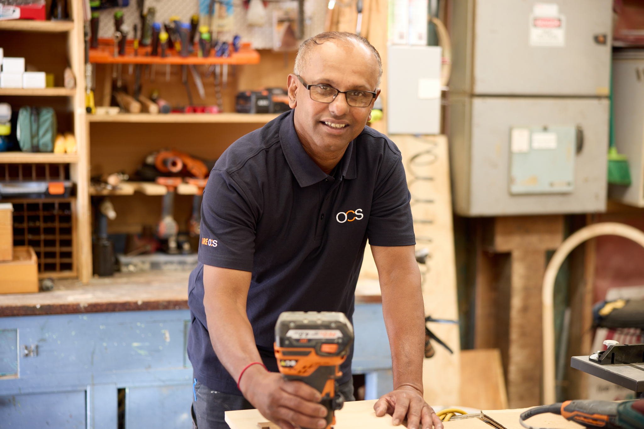 A smiling older man with glasses and a short beard stands with arms crossed, wearing a navy blue polo shirt with OCS and WE ARE OCS logos, in a modern office setting with large windows.